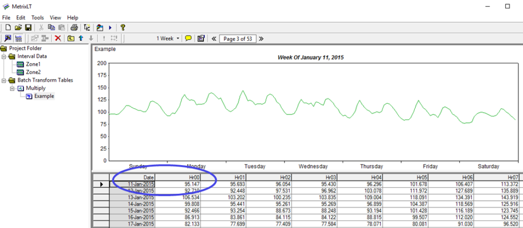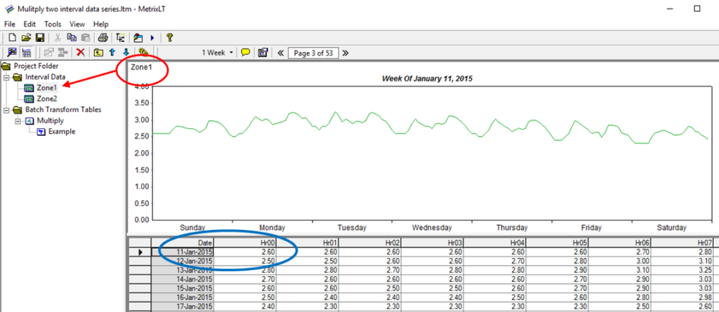 Use the Import Interval Data feature to create two hourly Data Tables in MetrixLT. In the example below, data for Zone1 and Zone2 are imported into MetrixLT. I’ve highlighted the January 11, 2015 values to check our work.